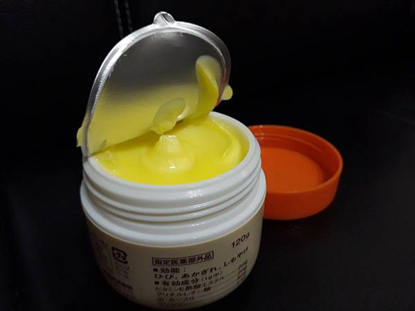 看到這yuskin悠斯晶A乳霜的色澤挺漂亮的,顏色是鮮黃色,它是維他命B2的顏色,味道應該就是樟腦的氣味居多,